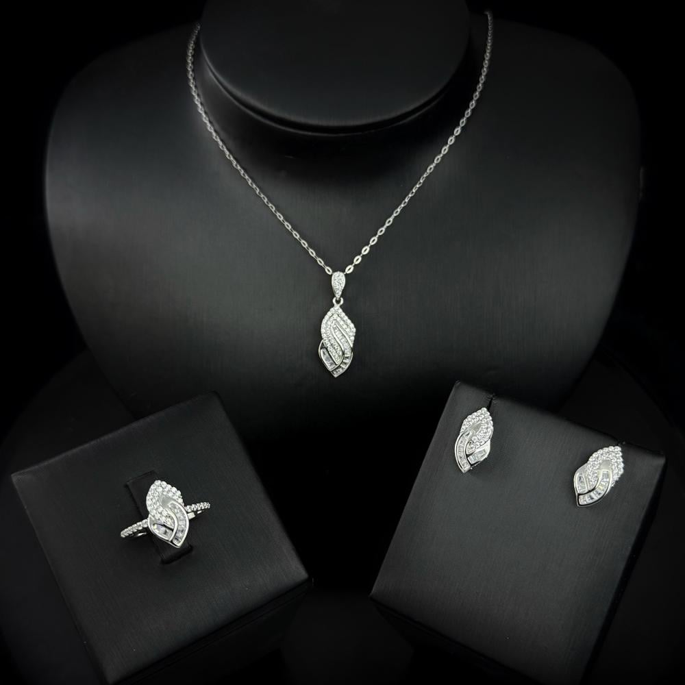 طقم ٣ قطع أنيق من رامس مصنوع من الفضة النقية عيار 925، تتميز بتصميمها الراقي الذي يضفي لمسة فاخرة على إطلالتك ، تمتاز بجودة عالية ولمعان يدوم مع مرور الوقت . مناسبة للإهداء أو لإضافة قطعة استثنائية إلى مجموعتك .